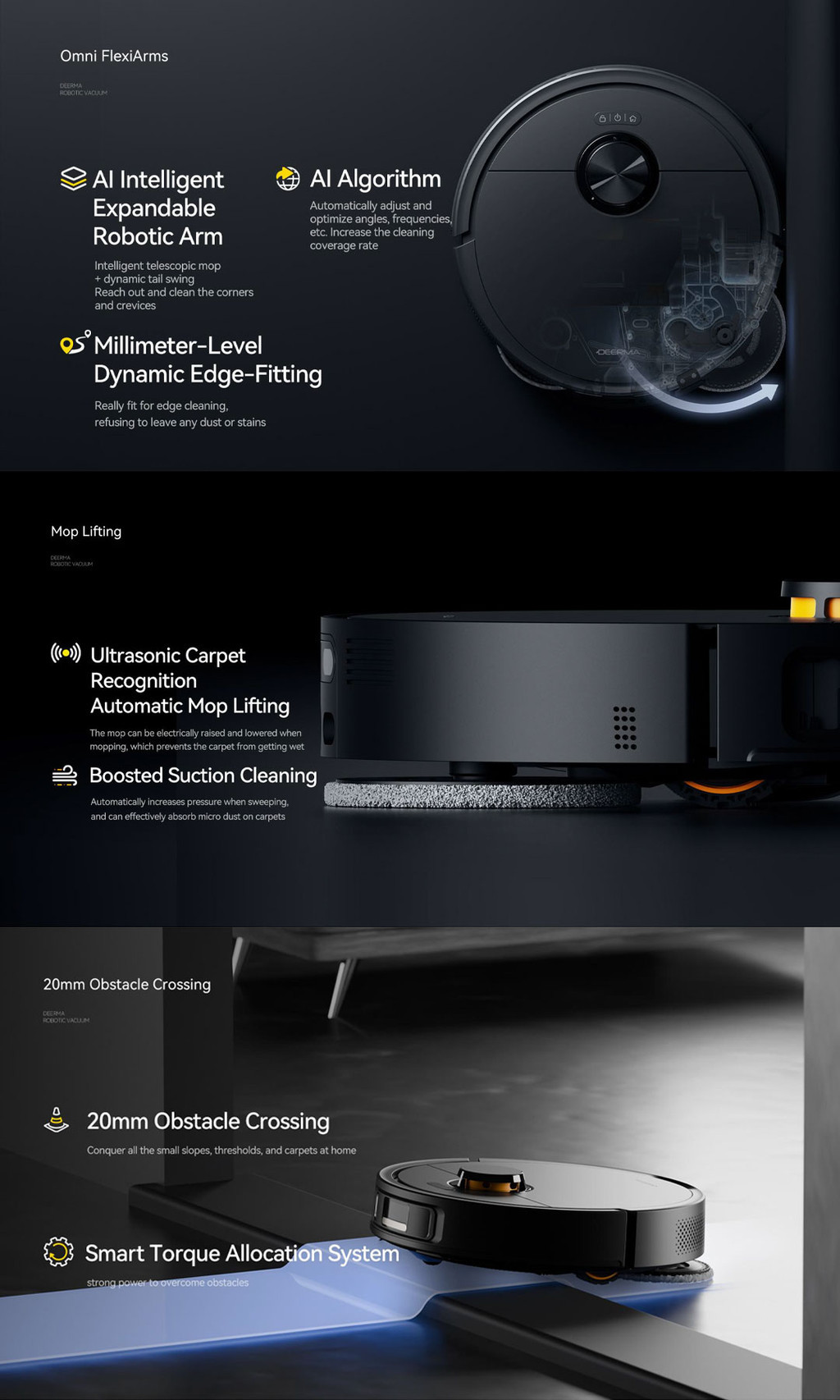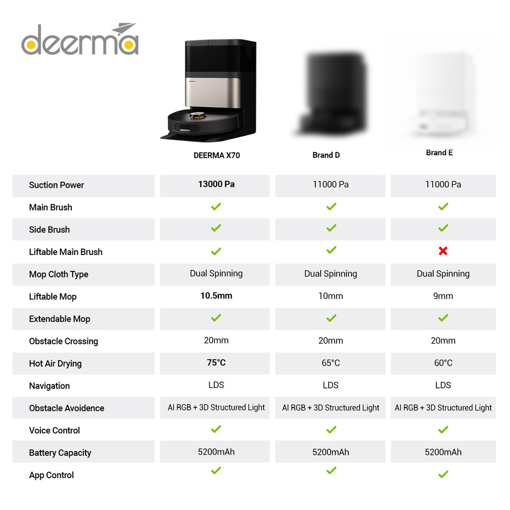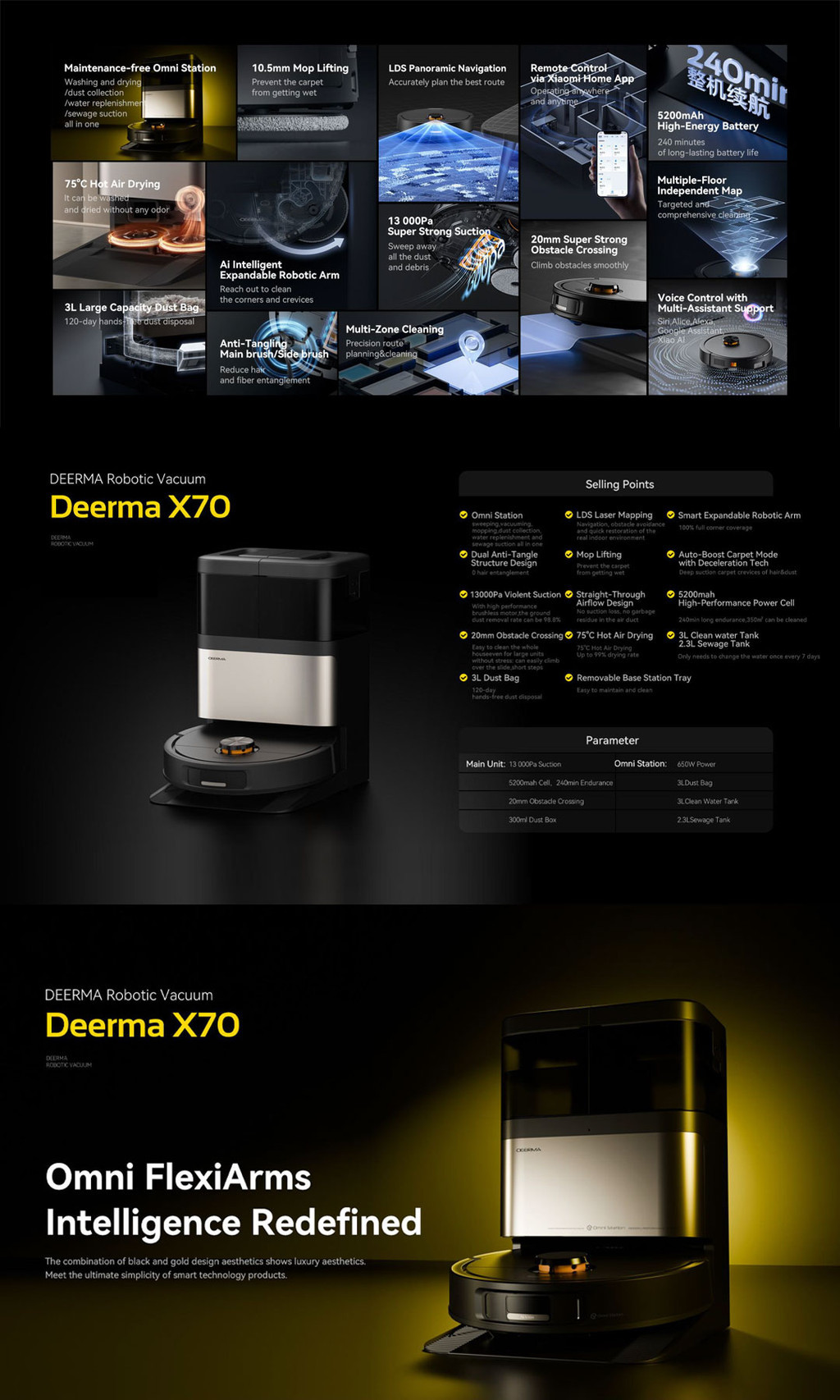 The DEERMA X70 is a smart, all-in-one robotic vacuum built for effortless home cleaning. It combines sweeping, vacuuming, mopping, auto dust collection, water refilling, and sewage disposal in one device. With powerful 13,000Pa suction, AI navigation, and features like mop lifting, hot air drying, anti-tangle brushes, and an extendable cleaning arm, the X70 delivers deep, hands-free cleaning for large and multi-surface homes.