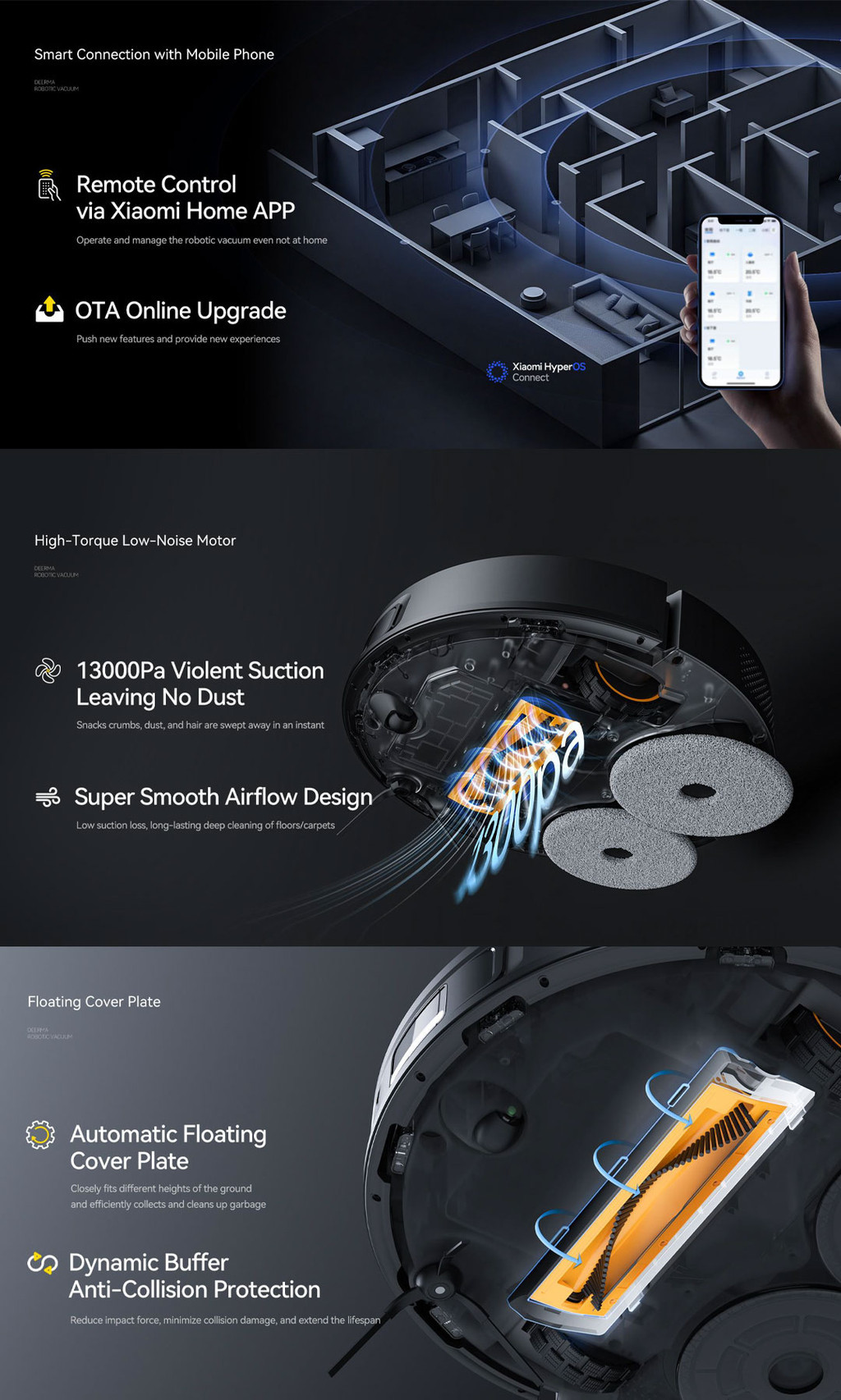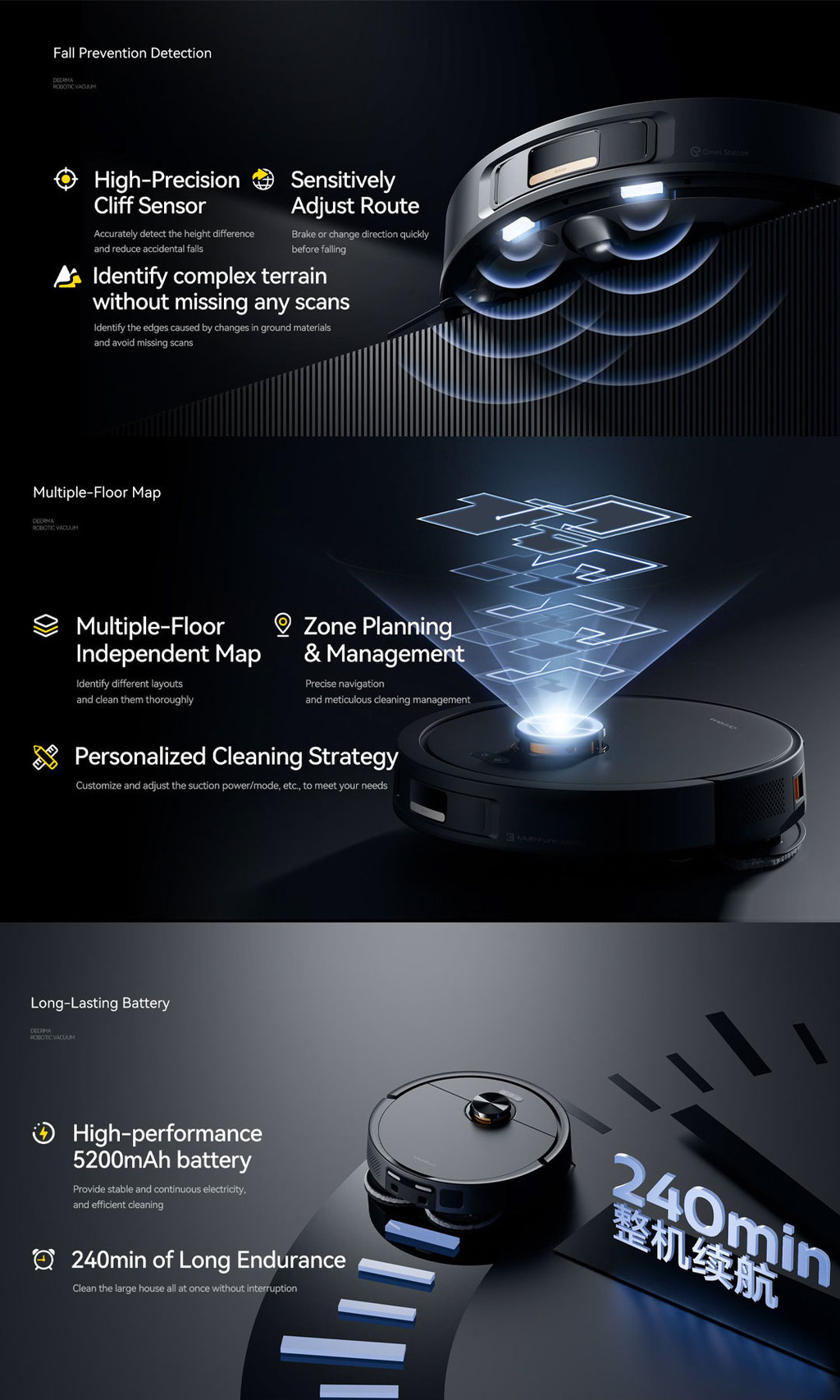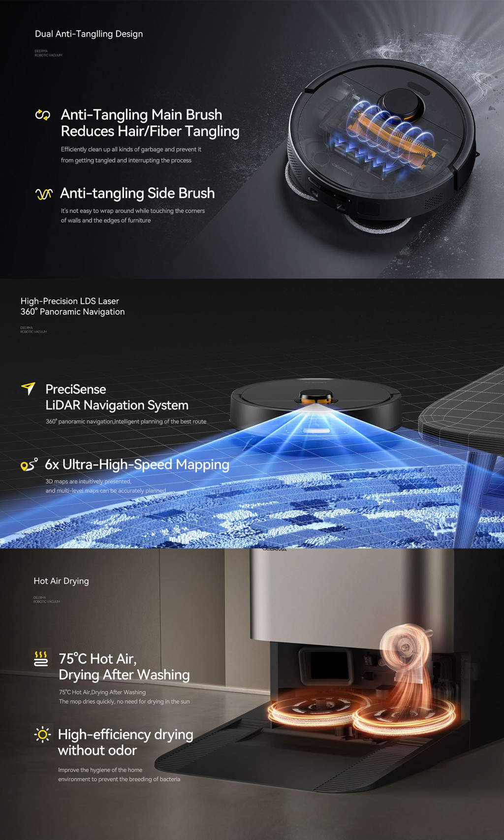 The DEERMA X70 is a smart, all-in-one robotic vacuum built for effortless home cleaning. It combines sweeping, vacuuming, mopping, auto dust collection, water refilling, and sewage disposal in one device. With powerful 13,000Pa suction, AI navigation, and features like mop lifting, hot air drying, anti-tangle brushes, and an extendable cleaning arm, the X70 delivers deep, hands-free cleaning for large and multi-surface homes.