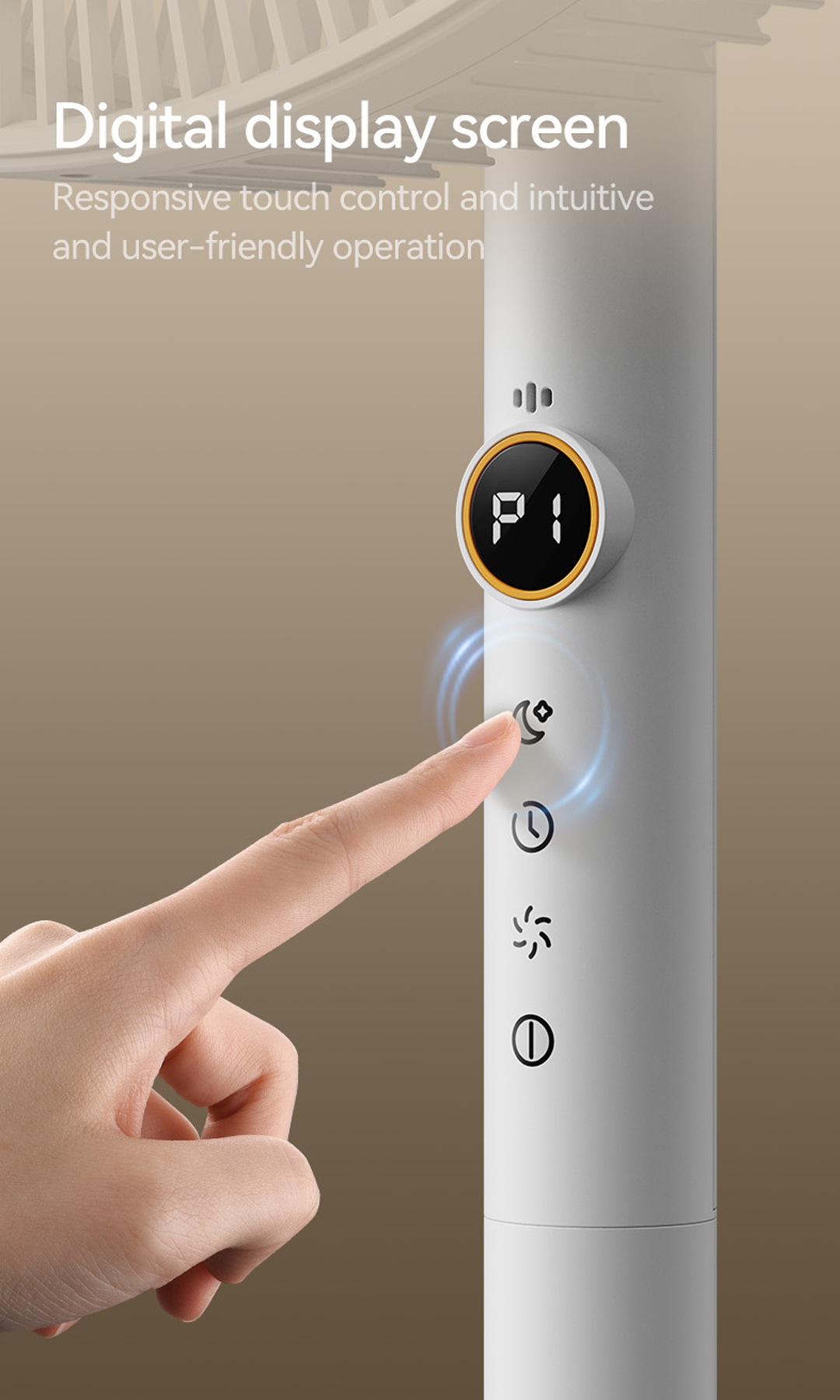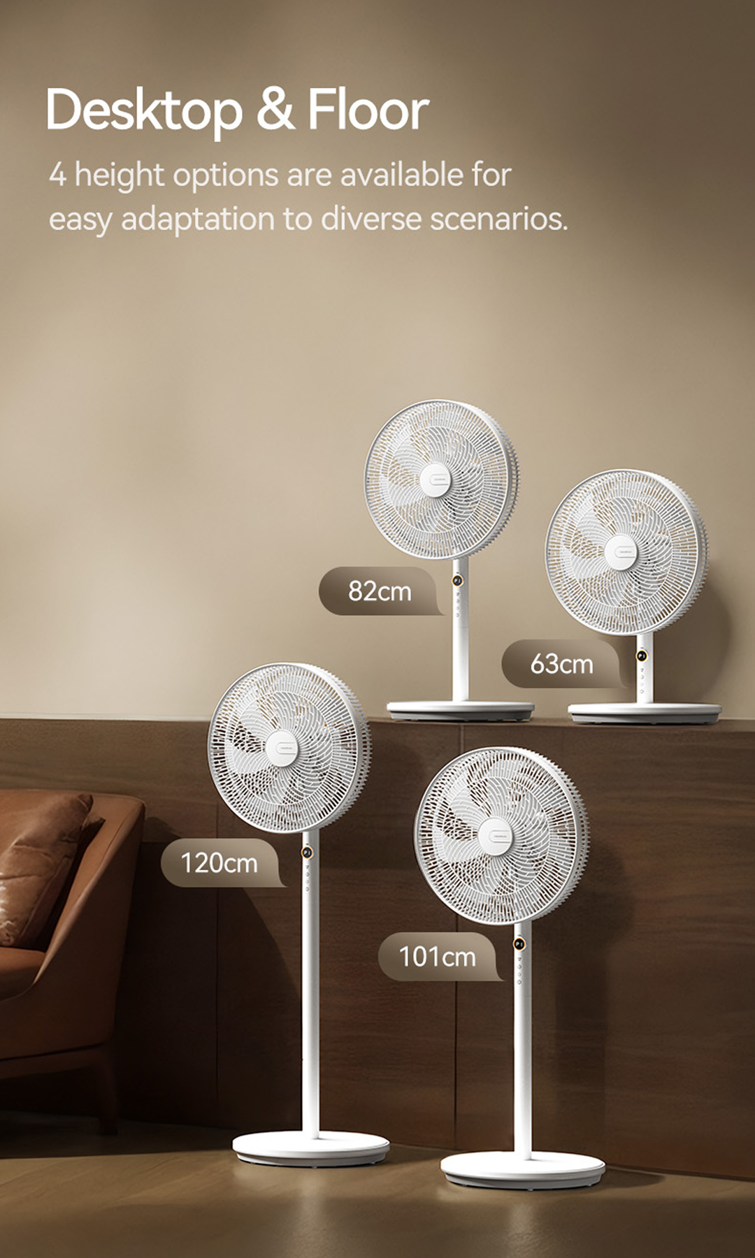 📌 Dual Mode Fan – Adjustable height (63–120 cm) for desktop or floor use, perfect for living rooms, bedrooms, or offices