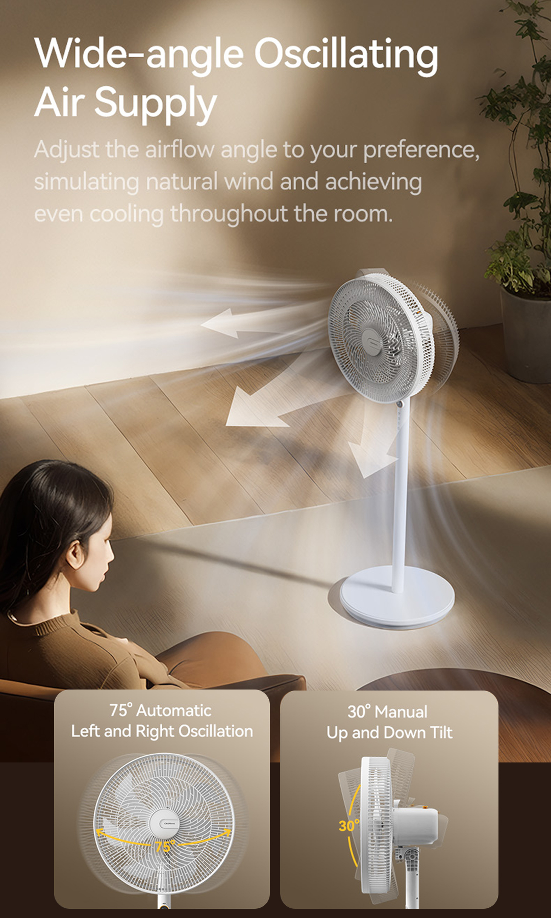 📌 Wide-Angle Airflow – 75° horizontal oscillation + 30° vertical tilt for even cooling