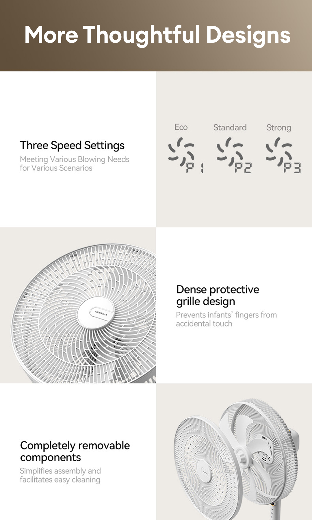 📌 Three Wind Speeds & Modes – Standard, ECO, Strong; automatic, night, and timer modes