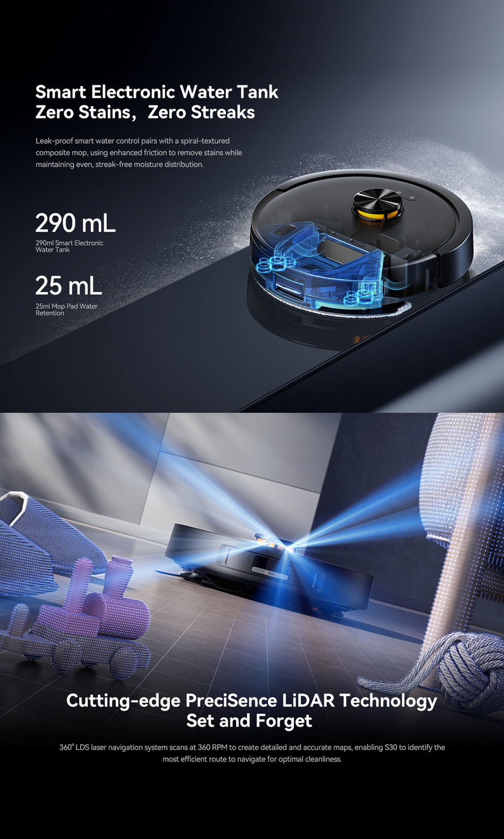 📌 Advanced Mopping System – 290mL smart electronic water tank; streak-free 25mL water retention mop pad